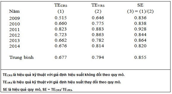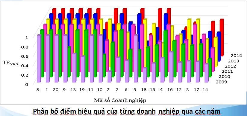 Những doanh nghiệp có quy mô lớn về doanh số và tài sản vốn (doanh nghiệp số 1, 8 và 20) đạt được hiệu quả hoàn toàn (TEVRS = 1) trong giai đoạn 2009-2014. Hơn một nửa số doanh nghiệp (12 doanh nghiệp) có chỉ số TEVRS thấp hơn mức hiệu quả trung bình trong mẫu nghiên cứu.