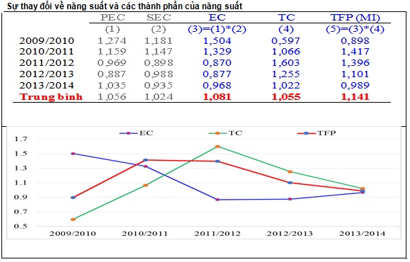 Sự thay đổi năng suất nhân tố tổng hợp (TFP) của các doanh nghiệp trong mẫu tăng lên khoảng 14,1%/năm là do sự tăng lên của hiệu quả kỹ thuật (EC) với 8,1%/năm và cải tiến công nghệ (TC) với 5,5%/năm. Nhìn chung, tăng trưởng năng suất trong những năm cuối là nhờ sự cải tiến về mặt công nghệ.