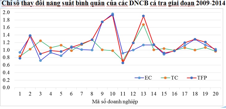 - Năng suất nhân tố tổng hợp (TFP) của các DNCB cá tra tăng lên 14,1%/năm: do sự tăng lên của hiệu quả sử dụng đầu vào (EC) với 8,1%/năm và cải tiến công nghệ (TC) với 5,5%/năm. Nhưng, tăng trưởng năng suất trong những năm cuối là nhờ sự cải tiến về mặt công nghệ.