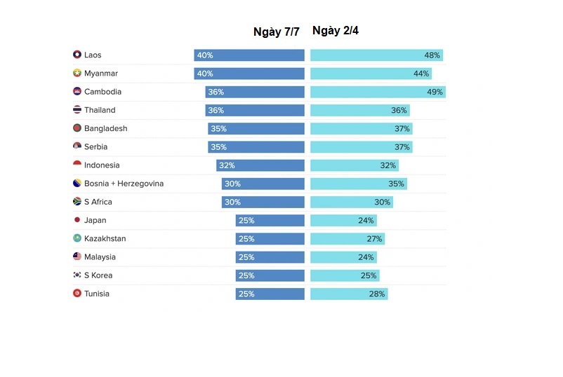 Trong ngày 7/7, Tổng thống Mỹ Donald Trump đã gửi thư thông báo thuế cho lãnh đạo của 14 nước gồm: Tunisia (25%), Indonesia (32%), Bosnia (30%), Bangladesh (35%), Serbia (35%), Campuchia (36%), Thái Lan (36%), Nhật Bản (25%), Hàn Quốc (25%), Malaysia (25%), Kazakhstan (25%), Nam Phi (30%), Lào (40%), Myanmar (40%).
