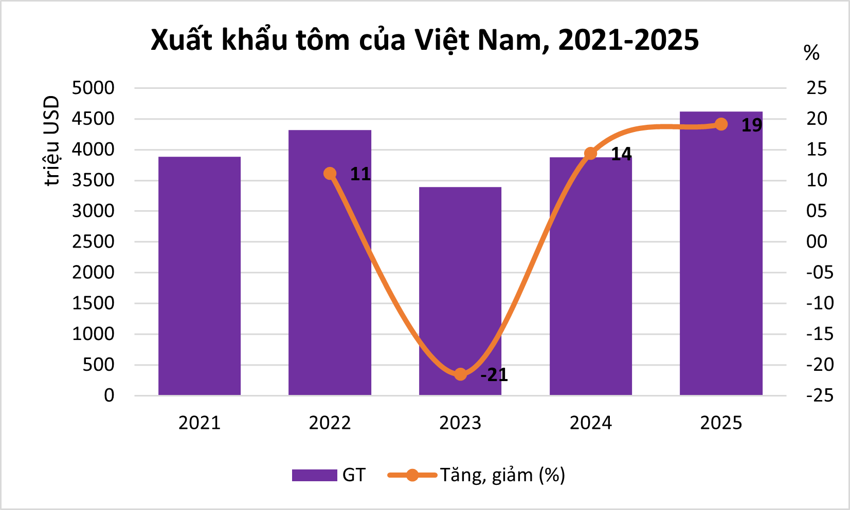 Năm 2025, kim ngạch XK tôm của Việt Nam đạt 4,6 tỷ USD, tăng 19% so với năm 2024 – mức cao nhất từ trước tới nay.