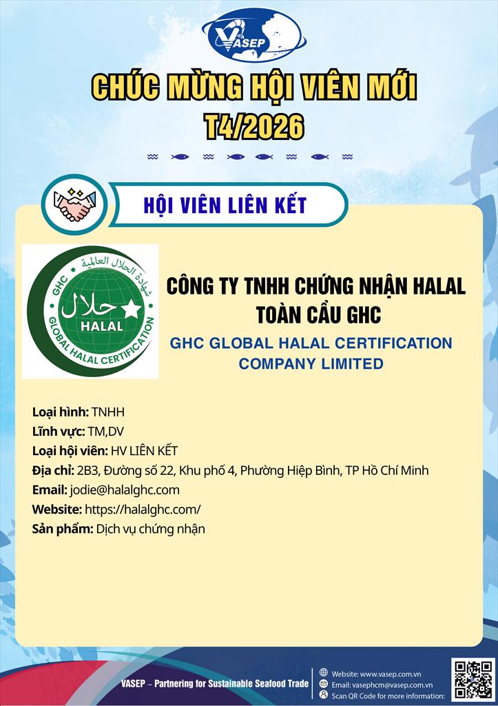 VASEP trân trọng chào đón Công ty TNHH Chứng nhận Halal Toàn cầu GHC và Công ty Cổ phần Transimex gia nhập mạng lưới hội viên, góp phần mở rộng hệ sinh thái dịch vụ hỗ trợ ngành thủy sản. Sự tham gia của hai doanh nghiệp được kỳ vọng sẽ tăng cường năng lực kết nối, logistics và đáp ứng tiêu chuẩn quốc tế cho cộng đồng doanh nghiệp.