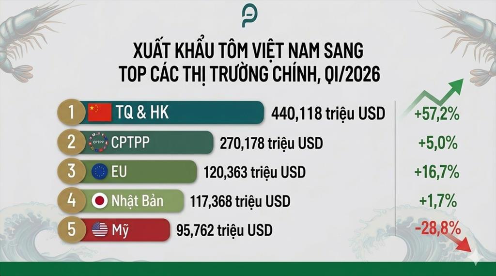 (vasep.com.vn) Quý I/2026, xuất khẩu tôm Việt Nam đạt 1,069 tỷ USD, tăng 17,5% so với cùng kỳ năm 2025. Đây là kết quả tích cực trong bối cảnh thị trường tôm thế giới chưa phục hồi đồng đều, cạnh tranh giữa các nguồn cung lớn ngày càng gay gắt, còn môi trường thương mại quốc tế tiếp tục biến động mạnh. Tuy vậy, mức tăng này không phản ánh một sự phục hồi đồng đều của toàn ngành, mà chủ yếu đến từ sự bứt phá của một số thị trường và một số nhóm sản phẩm cụ thể, nổi bật nhất là tôm hùm sang Trung Quốc.