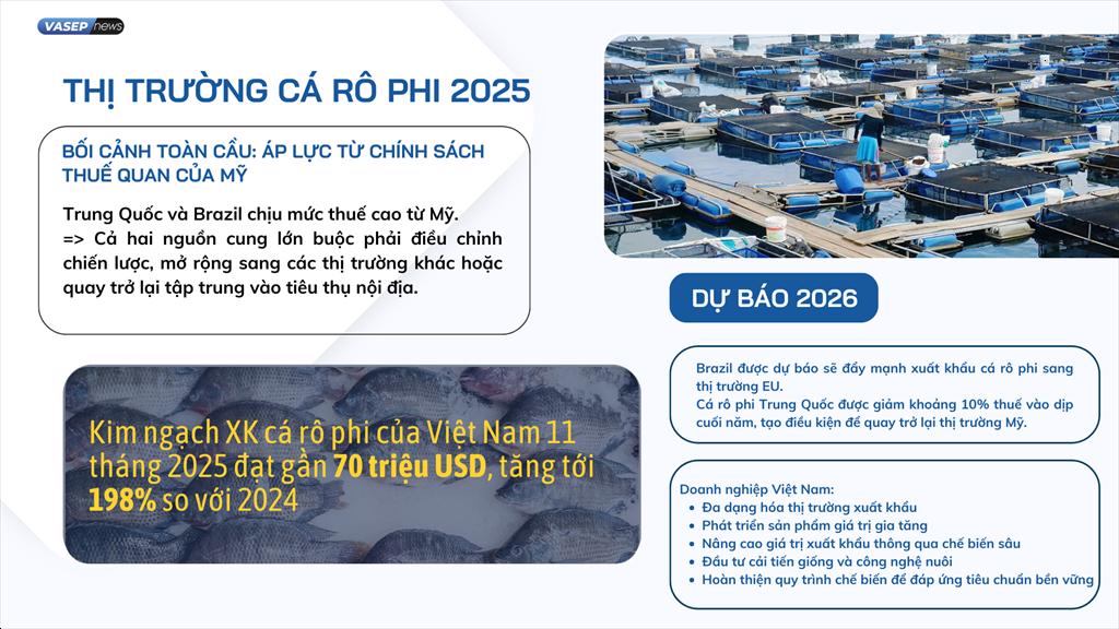 Đối với Việt Nam, bối cảnh mới đòi hỏi chiến lược chủ động và dài hơi hơn. Việc đa dạng hóa thị trường xuất khẩu sang châu Âu, Trung Đông và Nam Mỹ là cần thiết nhằm giảm phụ thuộc vào một số thị trường đơn lẻ. Đồng thời, phát triển các sản phẩm giá trị gia tăng như cá rô phi tẩm bột, chế biến sẵn hoặc đóng gói tiện lợi sẽ giúp nâng cao giá trị xuất khẩu.