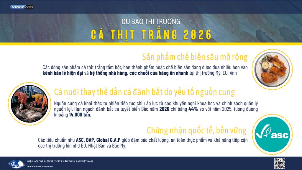 Về xu hướng tiêu dùng cá thịt trắng năm 2026, sản phẩm chế biến sâu dự kiến tiếp tục mở rộng tỷ trọng trong cơ cấu tiêu thụ. Tại các thị trường lớn như Mỹ, Liên minh châu Âu và Anh, nhu cầu đối với các sản phẩm tiện lợi, dễ chế biến, phù hợp với tiêu dùng tại gia và dịch vụ ăn uống tiếp tục duy trì ở mức cao.