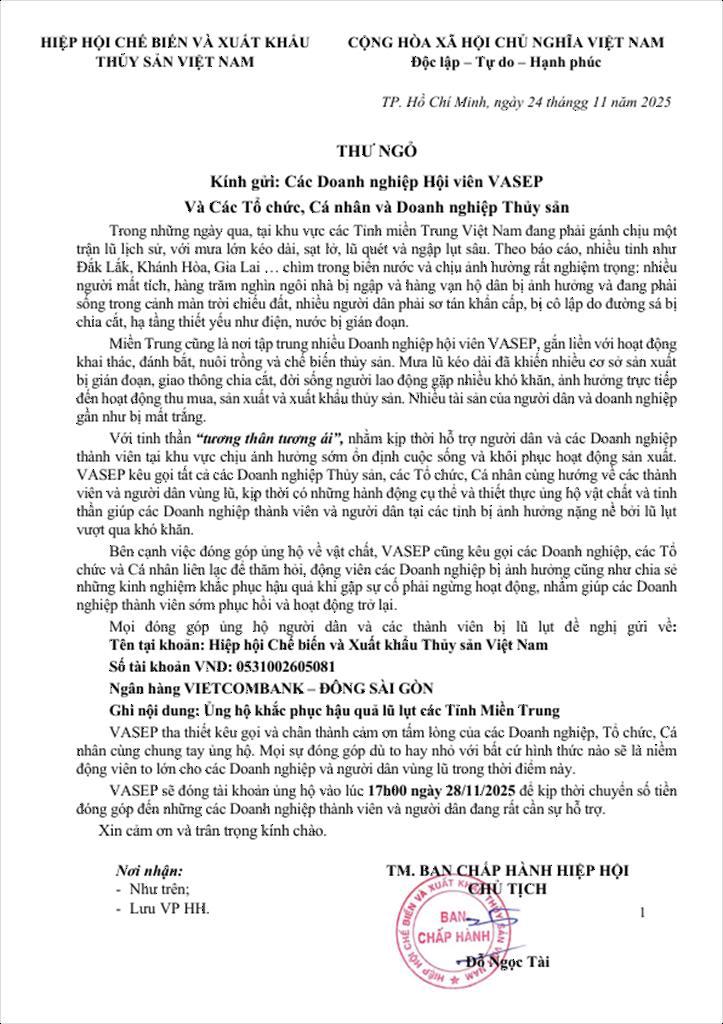 Trong những ngày qua, tại khu vực các Tỉnh miền Trung Việt Nam đang phải gánh chịu một trận lũ lịch sử, với mưa lớn kéo dài, sạt lở, lũ quét và ngập lụt sâu, ảnh hưởng rất nghiêm trọng tới hàng vạn hộ dân cùng nhiều Doanh nghiệp hội viên VASEP thuộc các tỉnh miền Trung, Với tinh thần “tương thân tương ái”, nhằm kịp thời hỗ trợ người dân và các Doanh nghiệp thành viên tại khu vực chịu ảnh hưởng sớm ổn định cuộc sống và khôi phục hoạt động sản xuất, VASEP kêu gọi tất cả các Doanh nghiệp Thủy sản, các Tổ chức, Cá nhân cùng hướng về các thành viên và người dân vùng lũ, kịp thời có những hành động cụ thể và thiết thực ủng hộ vật chất và tinh thần giúp các Doanh nghiệp thành viên và người dân tại các tỉnh bị ảnh hưởng nặng nề bởi lũ lụt vượt qua khó khăn.