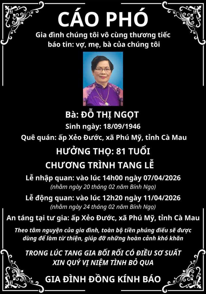 Cụ bà ĐỖ THỊ NGỌT là thân mẫu của ông Huỳnh Văn Tấn - Tổng Giám đốc Công ty CP CAMIMEX, Ủy viên BCH Hiệp hội, đã từ trần. Hưởng thọ: 81 tuổi