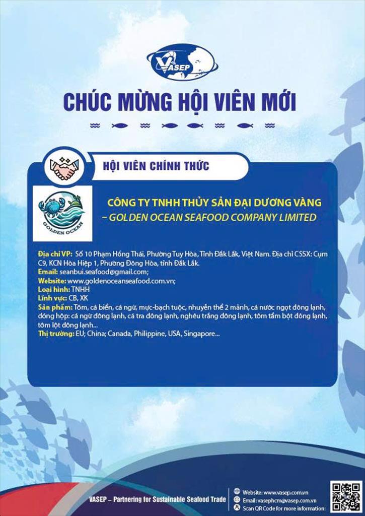VASEP trân trọng thông báo: Trong tuần qua, Hiệp hội đã kết nạp thêm 02 Hội viên mới. VASEP xin gửi lời chào mừng và kính chúc Quý doanh nghiệp phát triển bền vững, đồng hành cùng Hiệp hội trong các hoạt động liên kết và nâng tầm thương hiệu thủy sản Việt Nam.