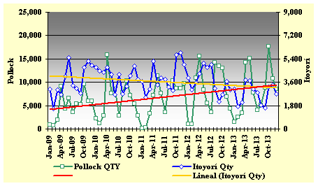 Thị trường: Năm 2013, Nhật Bản NK 132.248 tấn surimi các loại với giá trị đạt 32,876 tỷ yên, giảm 6% về khối lượng và 14% về giá trị so với so với năm 2012. Trong đó, Nhật Bản NK nhiều nhất surimi cá minh thái Alaska với 95.778 tấn, trị giá 23,615 tỷ yên, tăng 2% về khối lượng và giảm 10% về giá trị so với năm trước. Tiếp đến, là surimi itoyori với khối lượng NK đạt 32.765 tấn, trị giá 8,441 tỷ yên, giảm lần lượt là 24% và 23% so với năm 2012. Còn surimi các loại khác (chủ yếu từ cá tuyết Thái Bình Dương) NK với khối lượng khoảng 3.705 tấn tương đương với khối lượng NK của năm 2012.