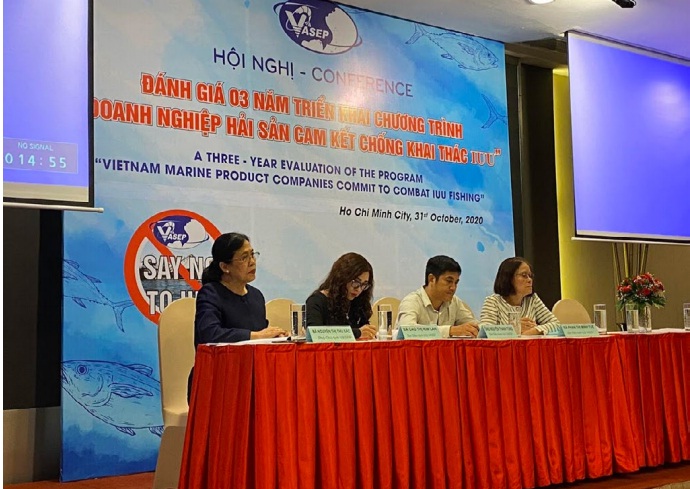 (vasep.com.vn) Tại Hội nghị “Đánh giá 3 năm triển khai chương trình Doanh nghiệp hải sản cam kết chống khai thác IUU” ngày 31/10/2020, VASEP nhận được đánh giá cao của Thứ trưởng Bộ NN và PTNT Phùng Đức Tiến, Phó Tổng Cục trưởng Tổng cục Thủy sản Nguyễn Quang Hùng, Đại diện Cảnh sát biển và các chi cục thủy sản, chi cục Thú y và Ban quản lý cảng cá các tỉnh địa phương về những nỗ lực trong các hoạt đống chống khai thác IUU trong 3 năm qua như sự tích cực góp ý văn bản, để cải thiện khung pháp lý đáp ứng quy định của EU, sự phối hợp, hợp tác chặt chẽ trong các hoạt động tuyên truyền, truyền thông và trao đổi thông tin với EC, cam kết của cộng đồng DN chống khai thác IUU…