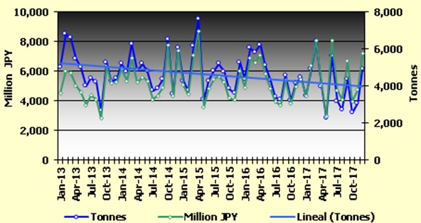 Tổng NK trong năm 2017 đạt 59.262 tấn và 53.092 triệu yên, giảm 14% về lượng và 5% về lượng so với năm 2016.