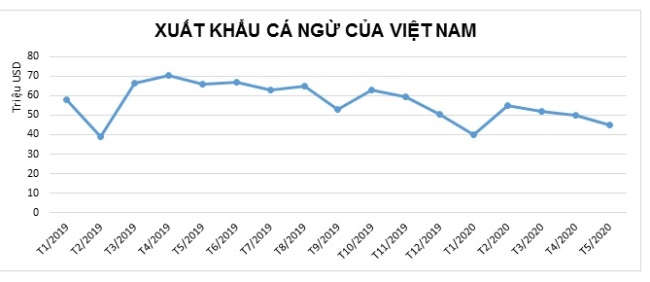 Tính đến hết tháng 5/2020, giá trị xuất khẩu cá ngừ của Việt Nam đạt gần 241 triệu USD, giảm gần 20% so với cùng kỳ năm 2019. Xuất khẩu sang phần lớn các thị trường trong tốp 10 thị trường nhập khẩu nhiều nhất cá ngừ của Việt Nam đều giảm về giá trị. Ngoại trừ xuất khẩu sang Nhật Bản tăng 31% và Ai Cập tăng 76% so với cùng kỳ.