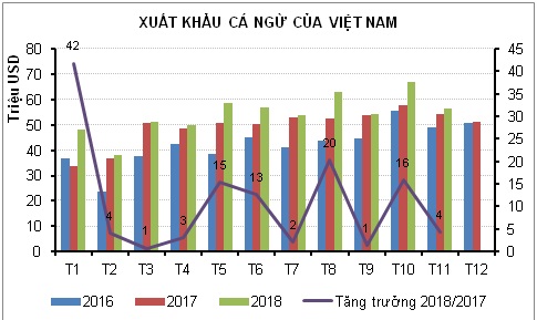 XK cá ngừ sang Mỹ trong tháng 11 tiếp tục có sự tăng trưởng. Giá trị XK cá ngừ sang Mỹ trong tháng 11 đạt 26 triệu USD, tăng 19% so với tháng 11/2017. Tuy nhiên sự tăng trưởng trong 2 tháng vừa qua không đủ bù đắp lại lượng sụt giảm trước đó nên tổng giá trị XK trong 11 tháng đầu năm vẫn giảm 0,6%, đạt 209 triệu USD. Năm nay, do sản lượng khai thác tại American Samoa giảm, nên Mỹ tăng cường NK từ các nước khác. Bên cạnh đó, do ảnh hưởng của cuộc chiến tranh thương mại Mỹ - Trung nên các nhà NK nước này chuyển hướng sang các nguồn cung khác. Dự kiến, trong tháng 12, XK cá ngừ của Việt Nam sang Mỹ sẽ vẫn tiếp tục tăng.