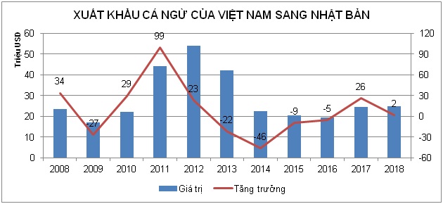 Tuy nhiên, từ năm 2013 – 2016, XK cá ngừ của Việt Nam sang Nhật Bản giảm liên tục xuống còn 19,3 triệu USD. Và hiện giá trị XK cá ngừ của Việt Nam sang thị trường này chỉ dao động ở mức 24-25 triệu USD. Sự sụt giảm này là do XK cá ngừ tươi sống và đông lạnh sang thị trường này giảm. Do đó, Nhật Bản từ thị trường XK cá ngừ lớn thứ 3 đã tụt xuống vị trí thứ 5 trong tốp 8 thị trường xuất khẩu cá ngừ lớn nhất của Việt Nam.