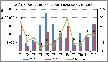 Sau sự tăng trưởng đáng chú ý trong năm 2017, XK cá ngừ của Việt Nam sang thị trường này năm 2018 giảm 24%,đạt 10,4 triệu USD. Hiện Mexico đang NK chủ yếu các sản phẩm thăn/philê cá ngừ đông lạnh mã HS0304 của Việt Nam. So với cùng kỳ năm 2017, XK mặt hàng này của Việt Nam sang Mexico đang tăng nhẹ.