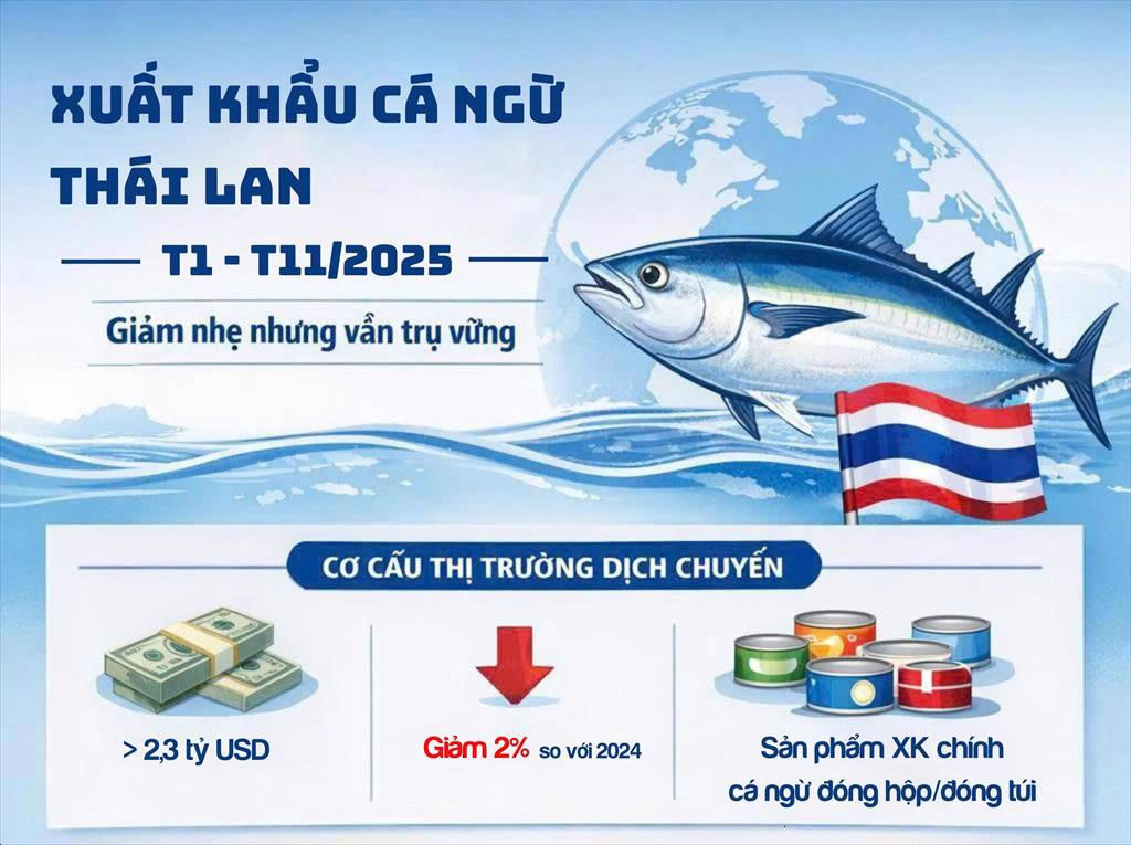(vasep.com.vn) 11 tháng đầu năm 2025, XK cá ngừ của Thái Lan đạt hơn 2,3 tỷ USD, giảm 2% so với cùng kỳ năm 2024. Thái Lan tiếp tục giữ vị thế trung tâm chế biến – xuất khẩu cá ngừ (đặc biệt là cá ngừ đóng hộp/đóng túi) nhờ năng lực chế biến quy mô lớn, hệ sinh thái nguyên liệu, logistics ổn định và sự dẫn dắt của các tập đoàn như Thai Union.