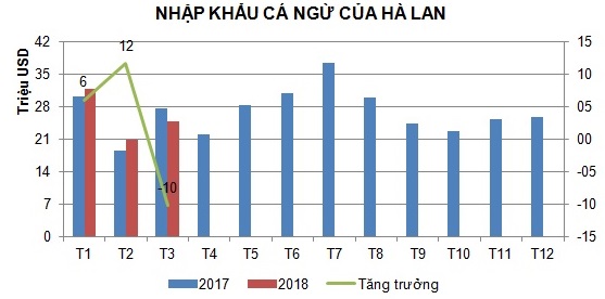 Hiện tính tổng 3 tháng đầu năm nay, Hà Lan đang tăng NK cá ngừ. Giá trị NK cá ngừ của nước này trong quý 1/2018 đạt 77 triệu USD, tăng 1,5% so với cùng kỳ. Tuy nhiên, riêng trong tháng 3, NK cá ngừ của nước này bắt đầu có xu hướng giảm so với cùng kỳ. Nguyên nhân là do NK cá ngừ đóng hộp và cá ngừ tươi sống, đông lạnh của nước này trừ thăn/philê cá ngừ đông lạnh giảm.