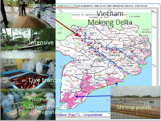 Việc liên kết theo chiều dọc mang tính tập trung ngày càng tăng của các trang trại nuôi cá tra / basa thâm canh dọc theo các sông chính và sông Mê Kông và các kênh chính. CF chuyển từ xu hướng 'lochs' và ‘off-shore’ nhỏ hơn trong các lĩnh vực nuôi cá hồi. Cả hai lĩnh vực có cường độ sản xuất tương tự.