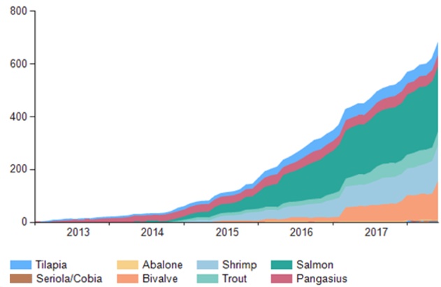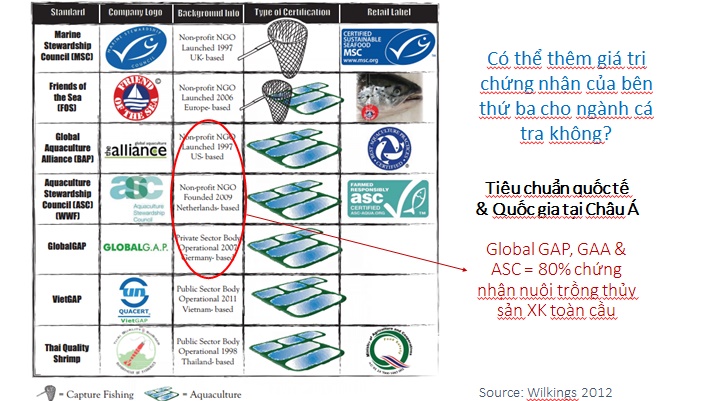 Trang trại cá tra được chứng nhận ASC - Tháng 7/2018: 2011: Biên bản ghi nhớ giữa ASC (WWF nguồn gốc) D-Fish, VASEP, VINAFISH, để đạt được chứng nhận 25% và 30% khối lượng sản xuất vào năm 2012 & 2014. Đã xóa danh sách đỏ khỏi danh sách đỏ của WWF. Tuy nhiên mức tăng còn thấp: từ 43 trang trại tháng 5/2012 chỉ lên 45 trong tháng 7/2015, sản lượng 210.210 tấn; <15% tổng sản lượng.