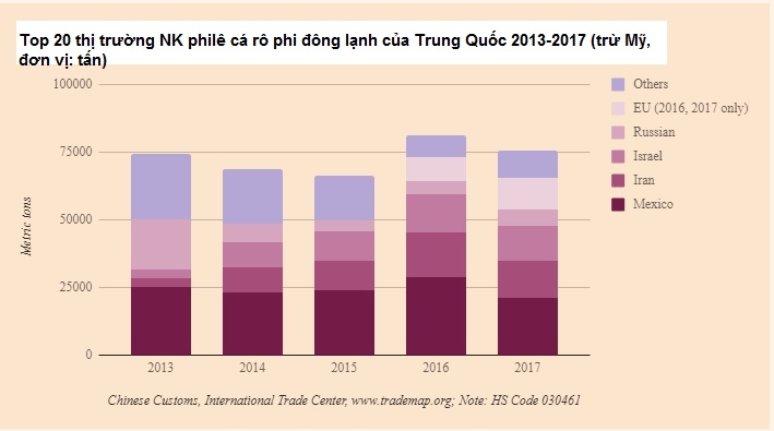 Các thị trường XK lớn thứ 2, thứ 3 và thứ 4 của Trung Quốc là Mexico, Iran và Israel đều tăng trưởng trong ba năm liên tiếp. Tuy nhiên, theo số liệu của Hải quan Trung Quốc năm 2017, các thị trường này đều giảm lượng NK philê cá rô phi đông lạnh từ Trung Quốc xuống 20% so với năm ngoái, đạt 59.468 tấn, mức giảm lớn hơn so với Mỹ.