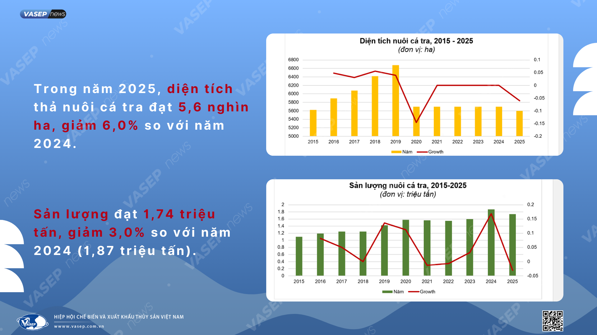 - Quy mô sản xuất lớn: Việt Nam là quốc gia sản xuất cá tra lớn nhất thế giới, có quy mô sản xuất rất lớn, bao gồm cả nuôi trồng và chế biến. Trong 5 năm từ 2020-2025, diện tích thả nuôi cá tra có xu hướng giảm, kéo theo sự sụt giảm về sản lượng.