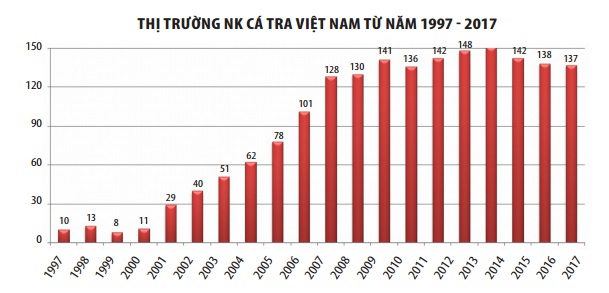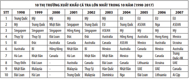 Có thể nói năm 1997 - 1998 là giai đoạn cá tra Việt Nam bắt đầu chập chững tìm đường xuất khẩu. Năm 1997, cả nước mới chỉ XK 425 tấn cá tra với tổng giá trị trên 1,65 triệu USD. Như vậy, XK cá tra mới chiếm tỷ lệ 0,2% tổng XK thủy sản và bằng 0,6% tổng XK sản phẩm tôm. Tuy nhiên, trong giai đoạnđầu sơ khai này, giá cá tra XK lại ở mức “hoàng kim nhất” dao động ở mức 3,9 - 4,1 USD/kg. Trong đó, các DN tập trung XK nhiều nhất đi các thị trường lân cận trong khu vực như Trung Quốc - Hồng Kông, Singapore và Đài Loan. Trong đó, gần 50% lượng cá tra được XK sang thị trường láng giềng Trung Quốc - Hồng Kông.