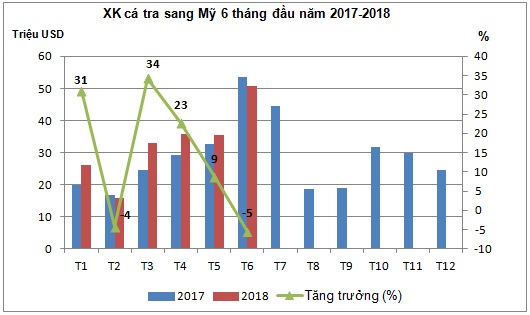 Tính đến hết tháng 6/2018, tổng giá trị XK cá tra sang thị trường Mỹ đạt 196,8 triệu USD, chiếm 19,6% tổng XK cá tra và tăng 11,6% so với cùng kỳ năm trước. Mặc dù, giá trị XK tăng so với cùng kỳ năm trước nhưng DN XK cá tra Việt Nam sang thị trường Mỹ vẫn còn đang chờ đợi thêm tín hiệu từ thị trường để có những bước đi trong thời gian tới.