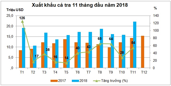 (vasep.com.vn) Có thể nói, năm 2018 là một năm XK cá tra sang thị trường ASEAN có nhiều thuận lợi. Tính đến hết tháng 11/2018, tổng giá trị XK sang thị trường này đạt 183,5 triệu USD, tăng 43,7% so với cùng kỳ năm trước.