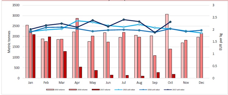 Theo thống kê của Globefish, 10 tháng đầu năm 2017, đến giá NK trung bình sản phẩm tra tra phile đông lạnh của nước này cũng không ổn định. Giá cao nhất vào khoảng quý II/2017, dao động từ 2 – 2,3 EUR/kg. Sau đó, vào tháng 9/2017, giá NK cá tra phile đông lạnh của Tây Ban Nha giảm đột ngột xuống mức 1,6 - 1,7 EUR/kg. Từ khối lượng NK 2.000 - 2.200 tấn/tháng trong tháng 1-2/2017, khối lượng cá tra NK vào Tây Ban Nha cũng giảm mạnh.