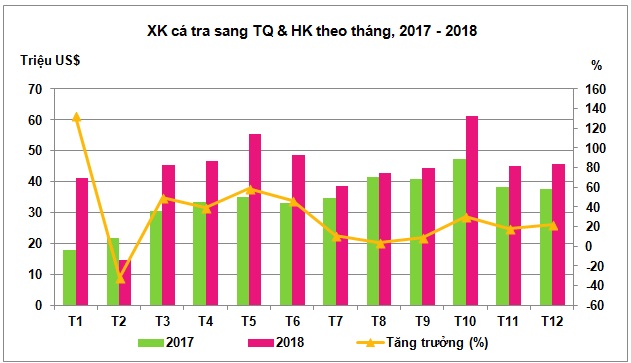 Từ năm 2015 đến 2018, xuất khẩu cá tra sang thị trường Trung Quốc - Hong Kong tăng trưởng liên tục 30 - 88% .