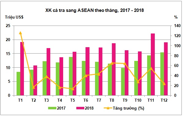 Thị trường xuất khẩu lớn thứ 4 của cá tra Việt Nam là ASEAN cũng đang trên đà tăng trưởng thuận lợi với giá trị tăng 41%. 3 thị trường xuất khẩu lớn nhất là Thái Lan, Singapore và Philippines có giá trị tăng lần lượt 48,8%; 20% và 32% . Thái lan chiếm 36,8% tổng giá trị XK sang cả khu vực. Đây là thị trường còn rất nhiều tiềm năng để khai thác nhiều loại sản phẩm từ cá tra khác nhau.