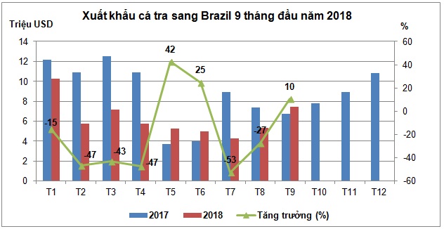 Trong ba quý đầu năm nay, duy nhất trong quý 2, XK cá tra sang thị trường này tăng trưởng tốt từ 24-42% so với cùng kỳ năm 2017 nhưng tính về giá trị XK lại thấp hơn so với quý 1 và quý 3/2018. Đây là bước giảm đột ngột so với năm trước bởi năm 2017, Brazil được coi là thị trường tiềm năng với mức tăng trưởng cao nhất trong bối cảnh các thị trường NK lớn như Mỹ, EU giảm.
