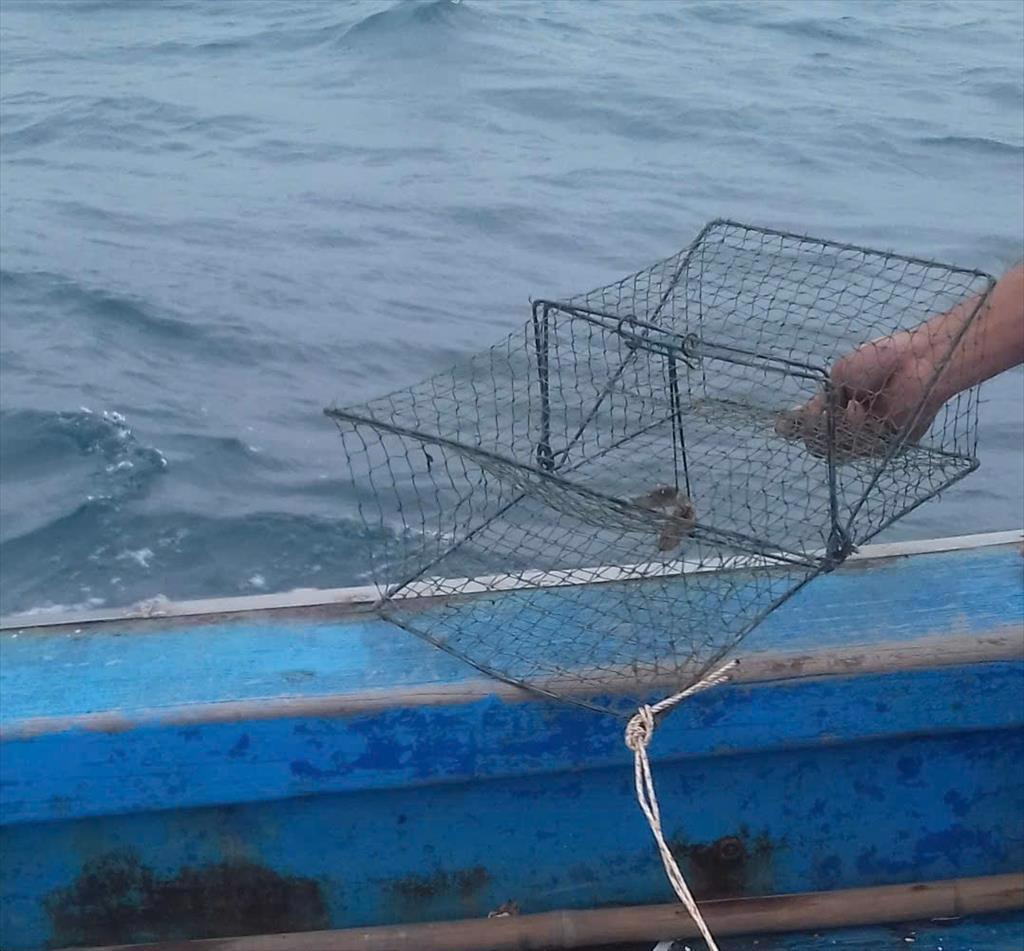 Phương pháp khai thác bằng bẫy: Tại ngư trường khai thác, ngư dân chuẩn bị hộp mồi để bỏ vào bẫy, sau đó xếp bẫy vào vị trí thao tác.