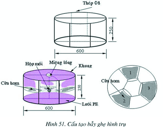 Bẫy hình trụ có đường kính 550 – 600 mm, chiều cao 200 – 250 mm, khung làm bằng thép tròn, đường kính 4 – 8 mm. Mặt trên và mặt dưới hình tròn, thành bẫy có 6 thanh, chia bẫy thành 6 khoảng bằng nhau, xung quanh bẫy được bọc lưới. Bẫy hình trụ có 3 cửa hom. Trong bẫy có hộp đựng mồi và được treo tại sợi dây nối từ 2 thanh nằm ngang của mặt trên và mặt dưới. Khi khai thác các bẫy được liên kết với nhau bằng một sợi dây chính, khoảng cách mỗi bẫy khoảng 20 – 25 m.