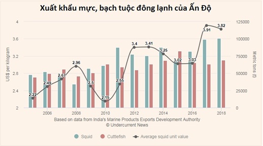 XK mực ống và mực nang đông lạnh chiếm 10% tổng giá trị XK thủy sản của Ấn Độ năm tài chính 2017/18.