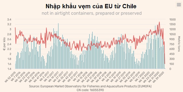(vasep.com.vn) Theo Cơ quan theo dõi thị trường sản phẩm thủy sản nuôi và khai thác Châu Âu, tính tới 4/10/2020, EU nhập khẩu 29.433 tấn vẹm chế biến (không đóng túi kín khí) từ Chile, tăng 19% so với cùng kỳ năm ngoái.