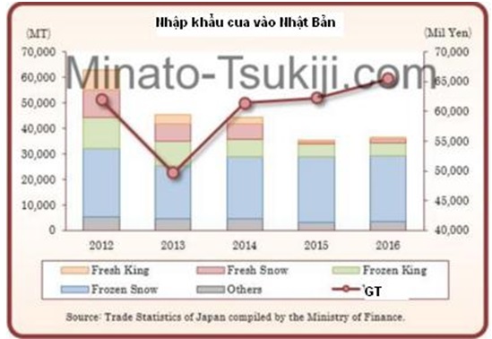 (vasep.com.vn) Theo thống kê của Bộ Tài chính Nhật Bản, nước này NK 36.495 tấn cua năm 2016, tăng 3% so với năm 2015. Giá trị NK mặt hàng này đạt 65,45 tỷ yên (582,49 triệu USD), tăng 5% so với năm 2015.