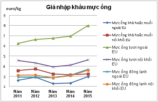 Mực tươi NK từ bên ngoài châu Âu có giá cao nhất, do chi phí cao vì vận chuyển bằng xe tải lạnh. Ngoài ra, NK mặt hàng này có giá cao vì mực ống được NK nguyên con từ Ma-rốc hoặc Nam Phi. Mực ống tươi NK trong nội khối EU có mức giá thấp hơn, vì sản phẩm này chủ yếu khai thác tại Châu Âu. Mực khô hoặc ướp muối có giá thấp nhất, vì sản phẩm này chủ yếu có chất lượng thấp hơn một chút. Bên cạnh đó, sản phẩm có một số thành phần bổ sung (chi phí thấp) như muối và đường và có thể vận chuyển mà không cần làm lạnh.