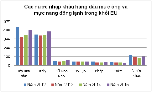 • Mực nang và mực ống đông lạnh: Ý (160 triệu euro), tiếp theo là Tây Ban Nha (43 triệu euro), Đức (25 triệu euro) và Bồ Đào Nha (25 triệu euro).