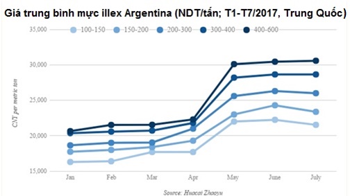 Theo Huacai, trong những tuần gần đây, giá mực illex đã giảm tại Trung Quốc. Ngày 9/8/2017, giá mực ống Argentina được giao dịch ở mức 24.000 NDT/tấn, giảm xuống từ 25.000 NDT/tấn, giảm từ mức trung bình 26.000 NDT/tấn vào tháng 7/2017.