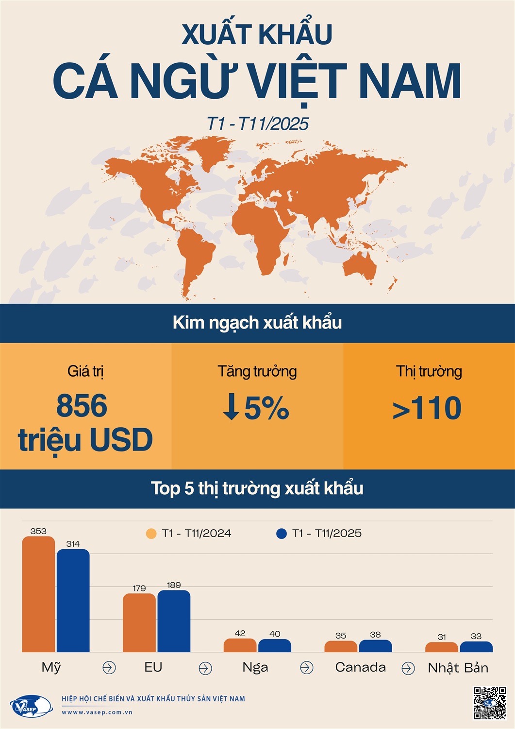 (vasep.com.vn) Xuất khẩu cá ngừ Việt Nam T1–T11/2025 đạt 856 triệu USD, giảm 5% nhưng vẫn phủ tới hơn 110 thị trường. Top 5 thị trường gồm Mỹ, EU, Nga, Canada, Nhật Bản.