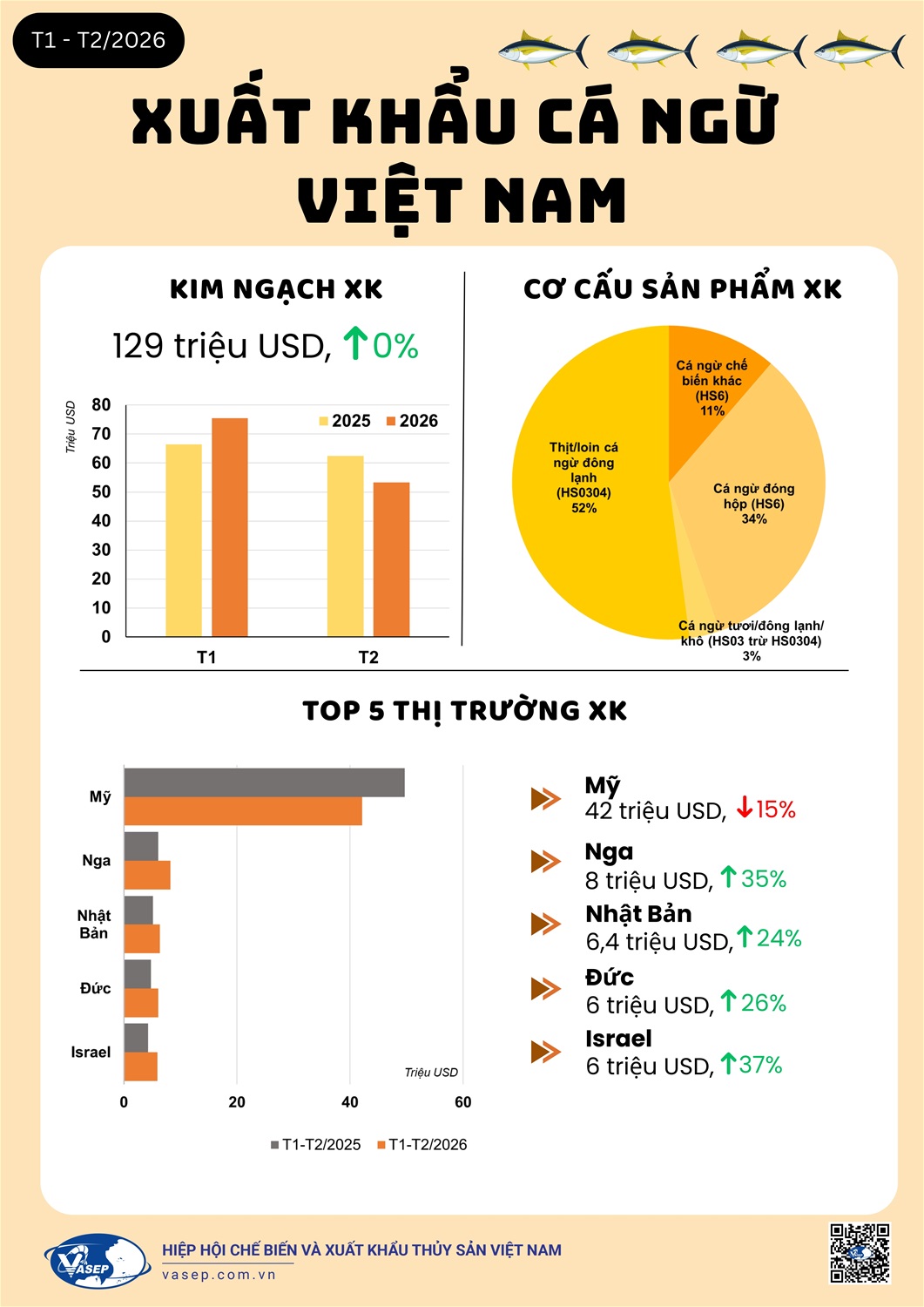 (vasep.com.vn) 2 tháng đầu năm 2026, xuất khẩu cá ngừ Việt Nam đạt 129 triệu USD, gần như đi ngang (0%). Mỹ vẫn là thị trường lớn nhất nhưng giảm 15%, trong khi Nga, Nhật Bản, Đức và Israel đều tăng mạnh