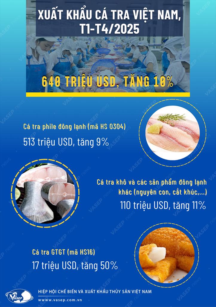 Infographic: Xuất khẩu cá tra Việt Nam 4 tháng đầu năm 2025
