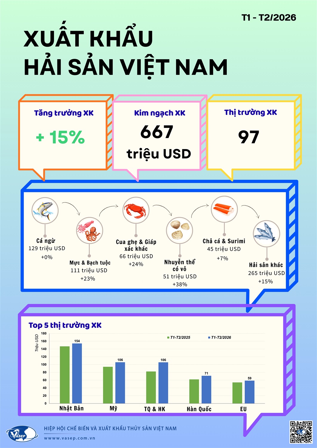 (vasep.com.vn) 2 tháng đầu năm 2026, xuất khẩu hải sản Việt Nam đạt 667 triệu USD, tăng 15% và đã hiện diện tại 97 thị trường. Nhóm tăng nổi bật là nhuyễn thể có vỏ +38%, cua ghẹ & giáp xác +24%, mực & bạch tuộc +23%.