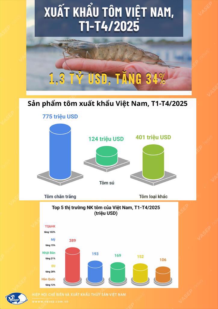 Infographic: Xuất khẩu tôm Việt Nam, T1-T4/2025