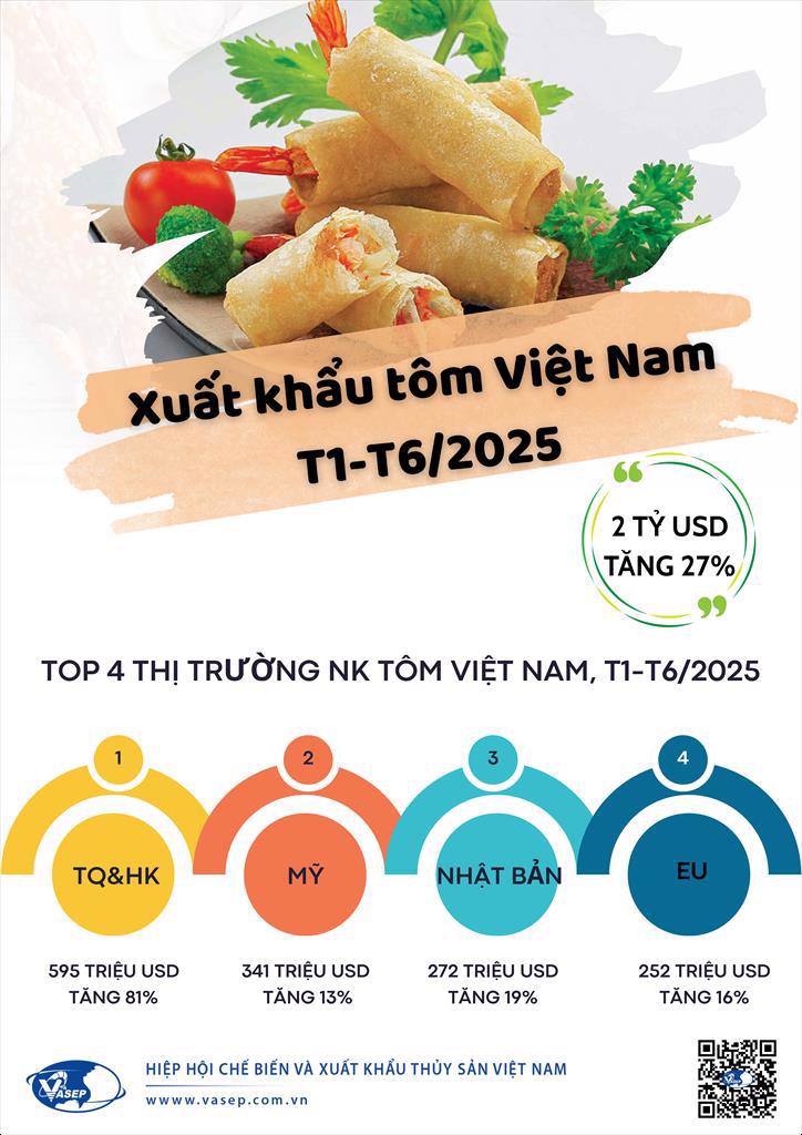 Infographic: Xuất khẩu tôm Việt Nam, T1-T6/2025