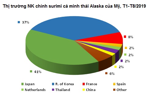 Trong tháng 8/2019, XK surimi cá minh thái Alaska của Mỹ đạt 33.061 tấn, trị giá 89.757.000 USD, tăng 140% về khối lượng và 143% về giá trị, giảm 11% về khối lượng và 8% về giá trị so với tháng 7/2019.