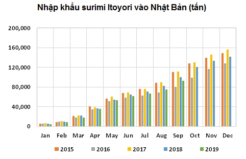 NK surimi cá minh thái Alaska trong 9 tháng đầu năm nay đạt 74.634 tấn, trị giá 27.476 triệu yên, giảm 7% về khối lượng và tăng 3% về giá trị so với cùng kỳ năm 2018. NK surimi itoyori đạt 12.906 tấn, trị giá 4.364 triệu yên, giảm 13% về khối lượng và 12% về giá trị so với cùng kỳ năm ngoái.