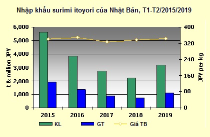 Tháng 2/2019, Nhật Bản NK 1.495 tấn surimi itoyori, trị giá 511 triệu yên, giảm 12% về khối lượng và giá trị so với tháng 1/2019; giảm 32% về khối lượng và 31% về giá trị so với tháng 2/2018.