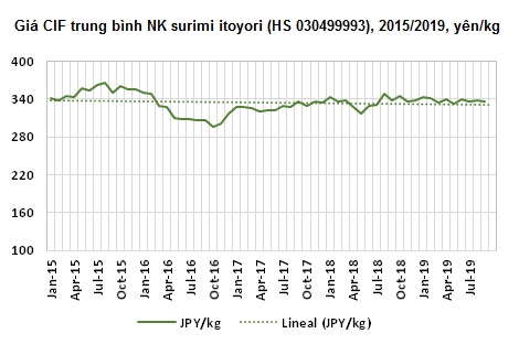 (vasep.com.vn) Theo Hải quan Nhật Bản, tháng 9/2019, giá CIF trung bình NK surimi itoyori của Nhật Bản đạt 336 yên/kg, giảm 1% so với tháng trước đó và tương đương so với như tháng 9/2018. Trong chín tháng đầu năm nay, giá trung bình đạt 338 yên/kg, tăng 1% so với cùng kỳ năm 2018.
